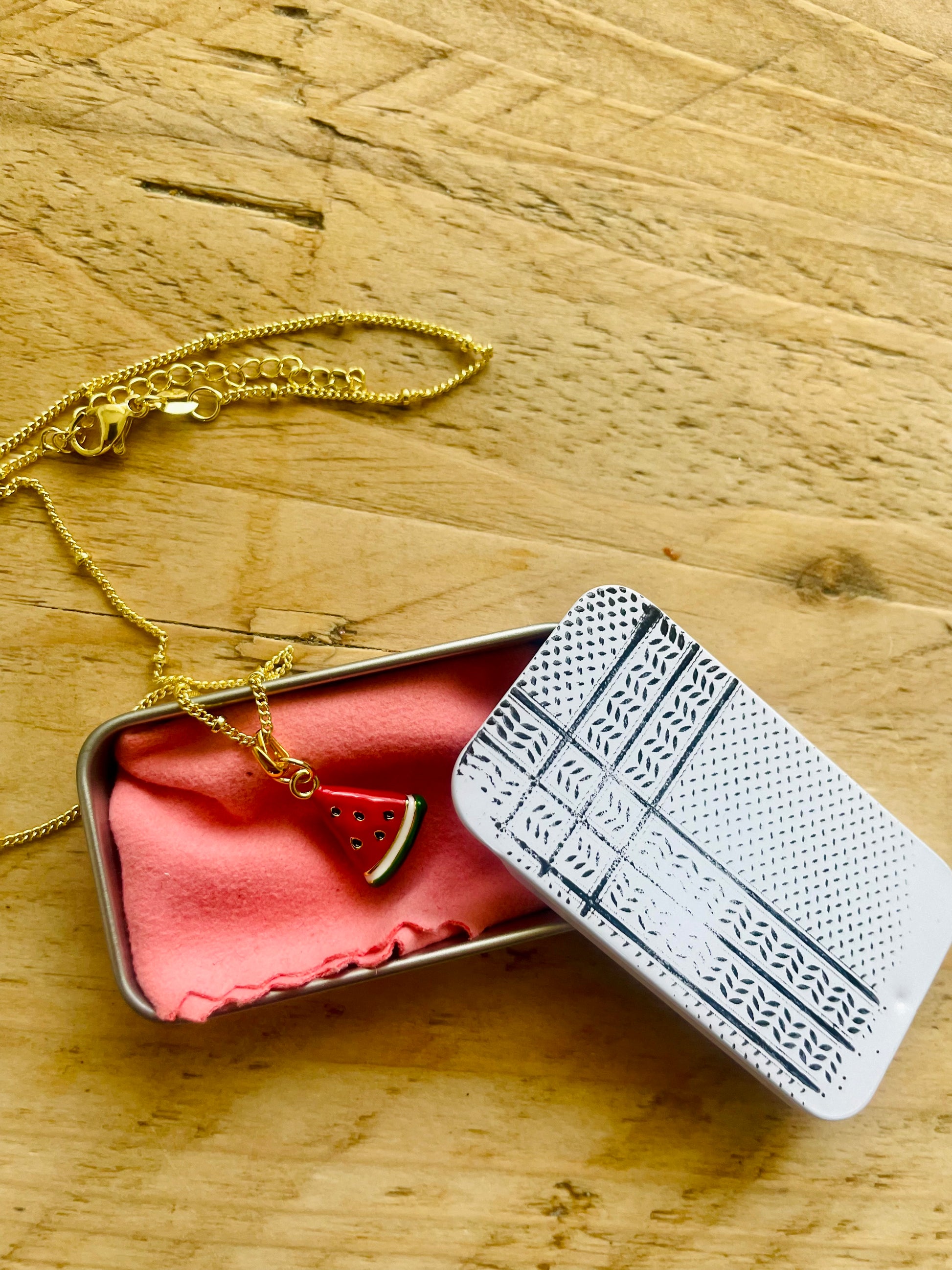 A bright enamel watermelon slice, edged in gold and full of meaning. Hopeful, symbolic and an act of solidarity.