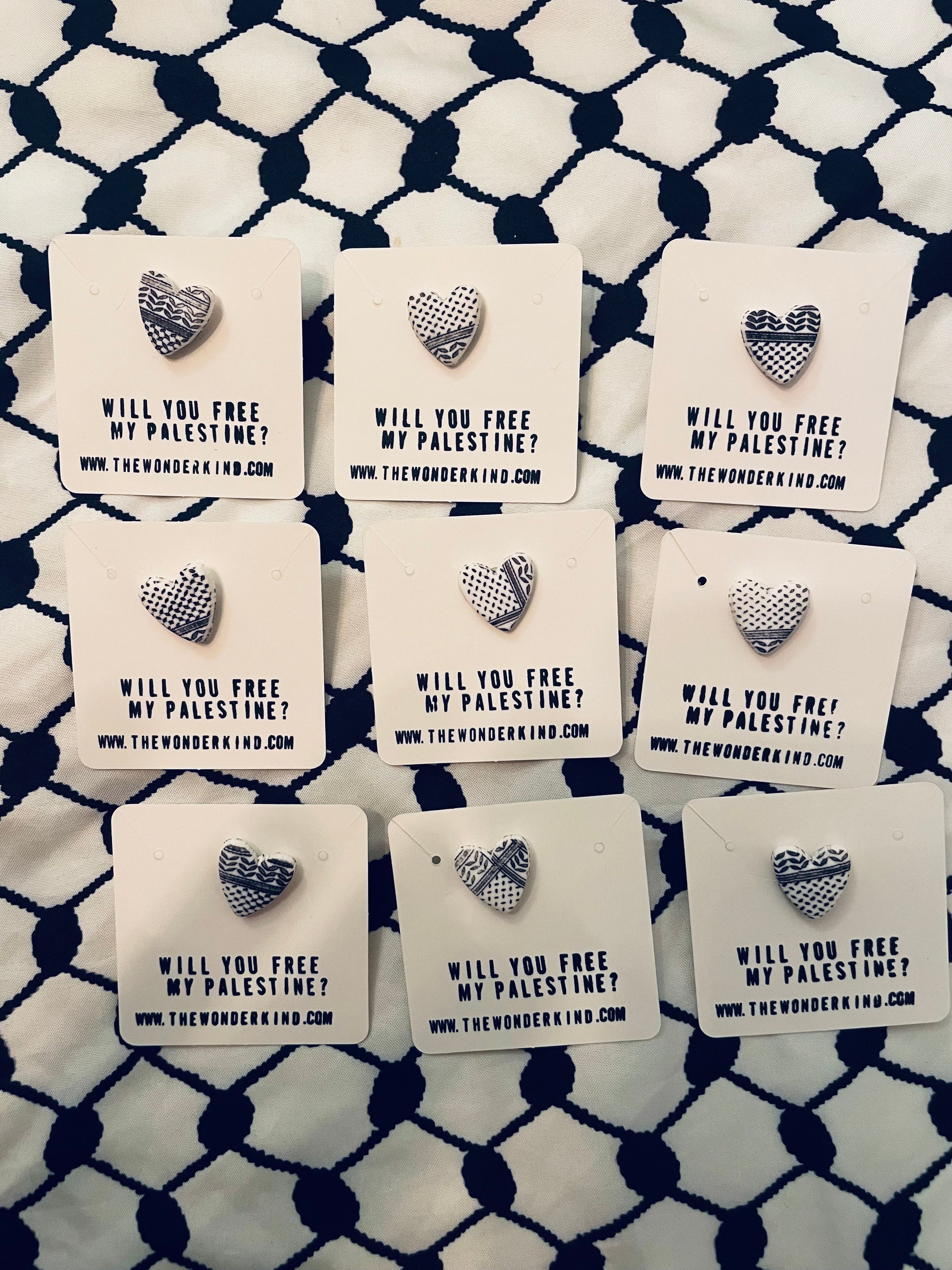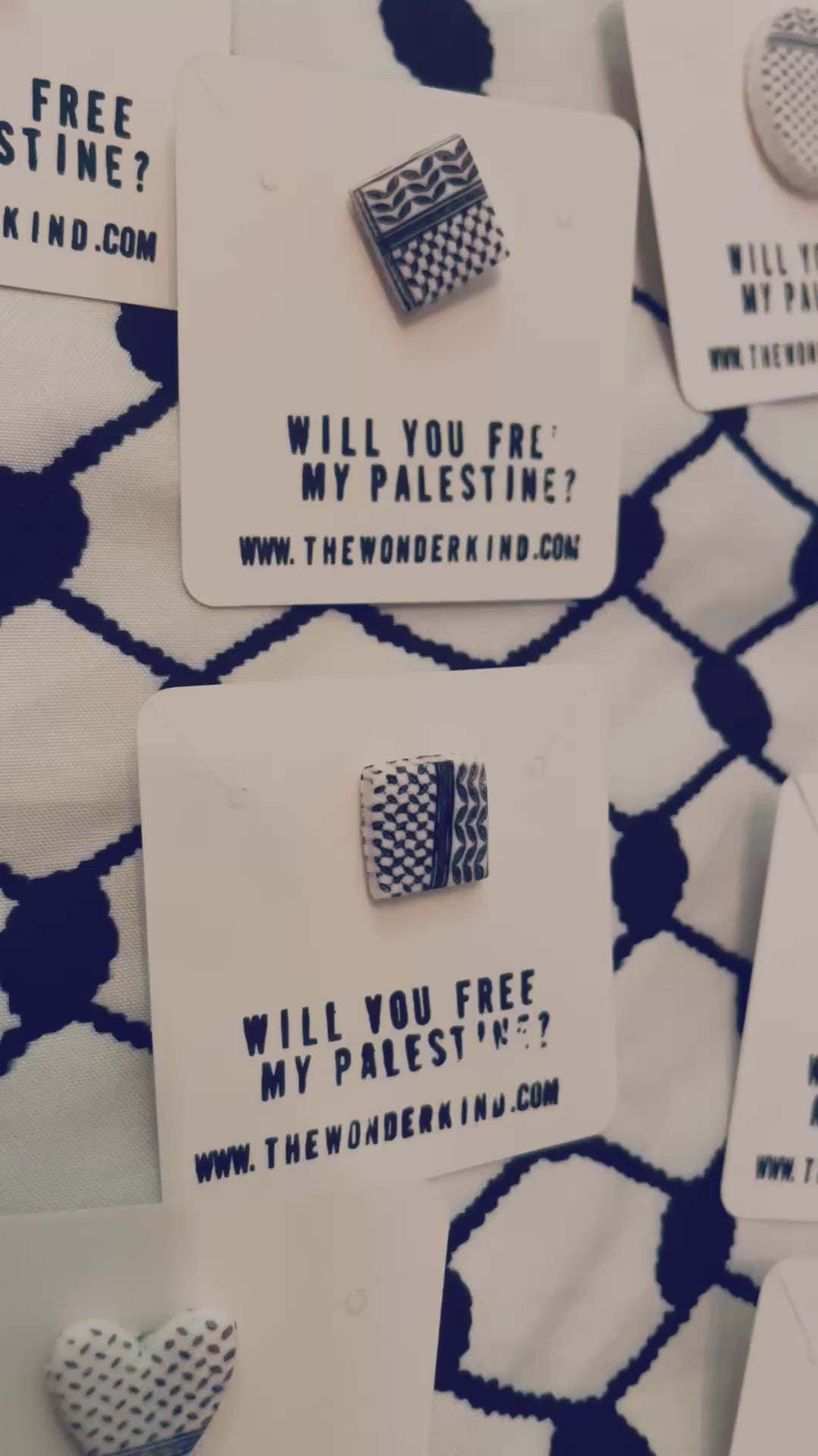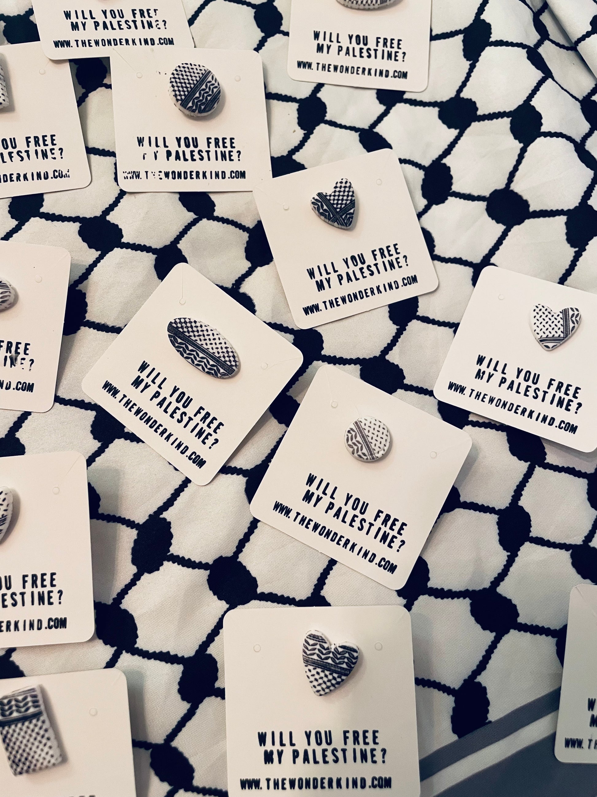 These little badges are cut from polymer clay, stamped by hand with the Palestinian keffiyeh print, and finished with pin backs. No machines, no mass production—just us, a few tools, and some late nights. Shapes and sizes vary. So does the stamping. Limited stock - I’ve only made 35 of these in this run.