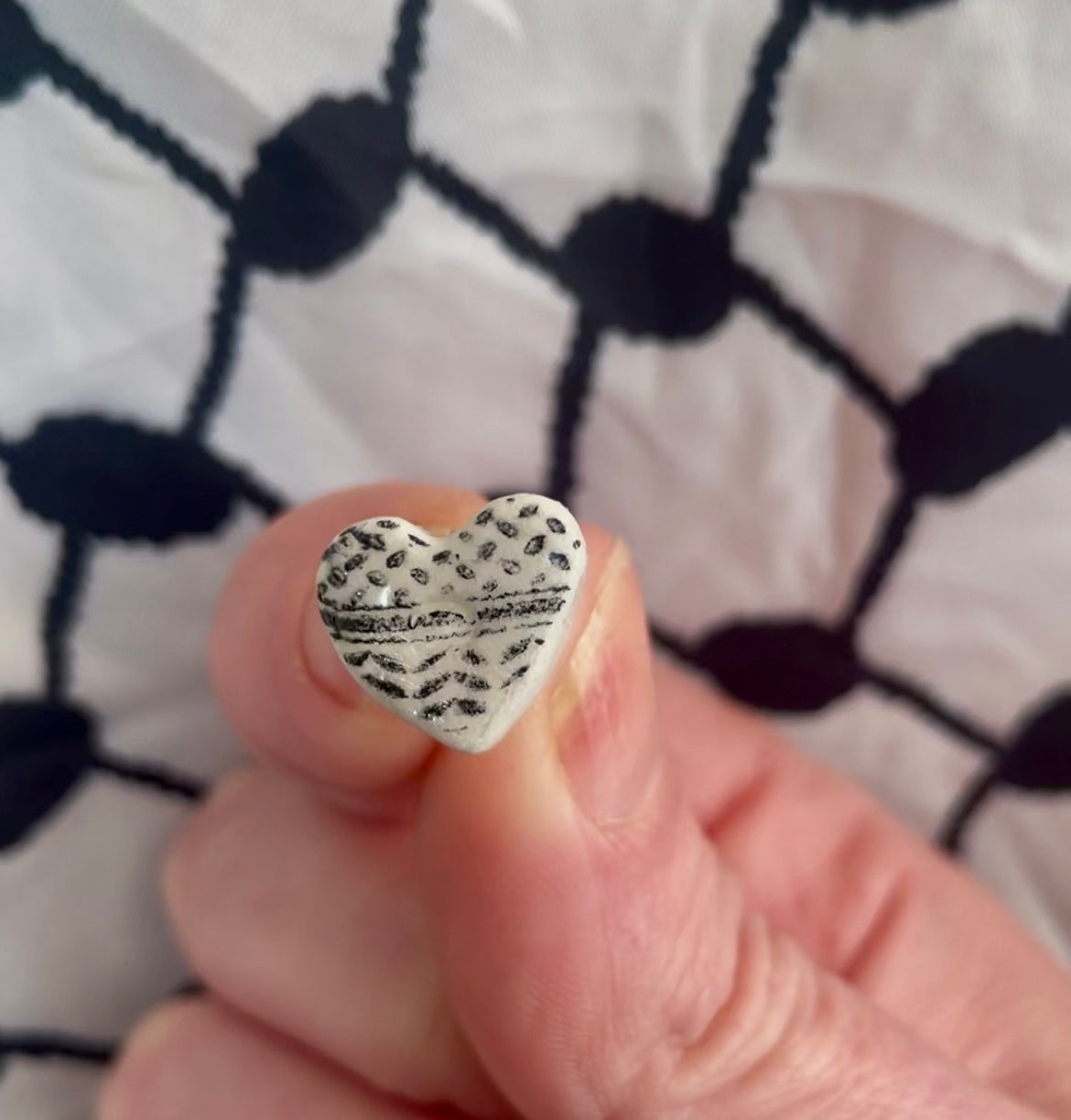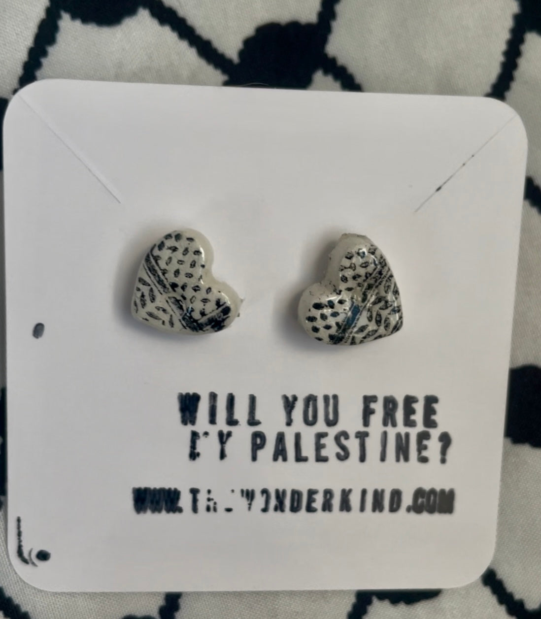 Hand made clay earrings hand stamped with the Keffiyeh print in aid of Palestinian mother Alaa.